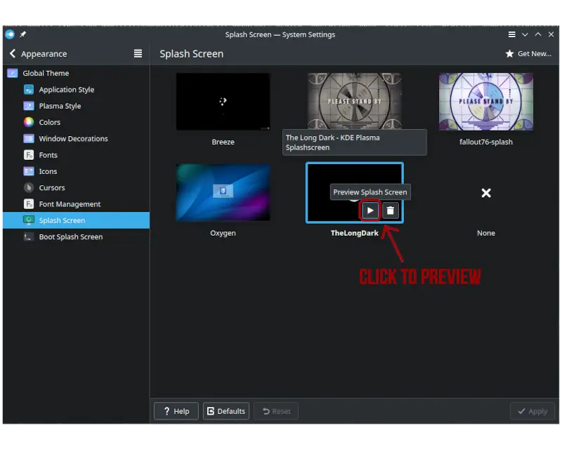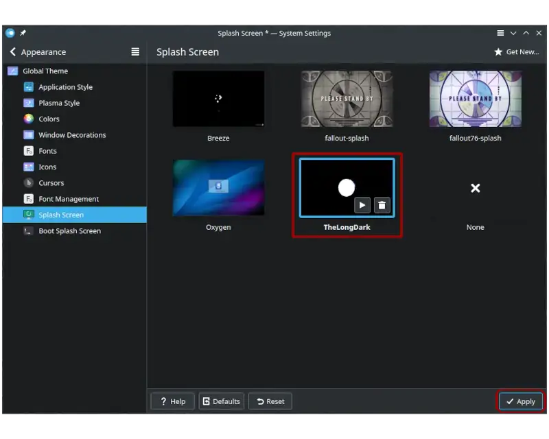 Select your new `The Long Dark Splash Screen` and then click 'Apply' in the bottom right hand corner of the `Splash Screen - System Settings` window.