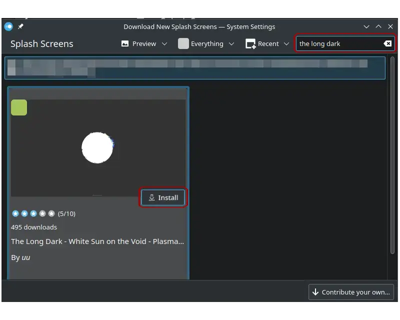 Type "The Long Dark" in the search box and press the 'Enter' key, once it loads press the 'Install' button on the Long Dark Splash Screen. When done close that window.